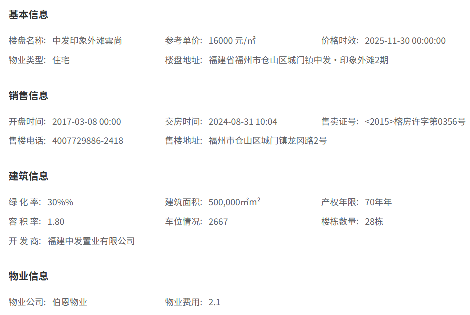 中发印象外滩雲尚由福建中发置业有限公司开发,物业公司为伯恩(福建)物业管理有限公司。 项目基本信息: