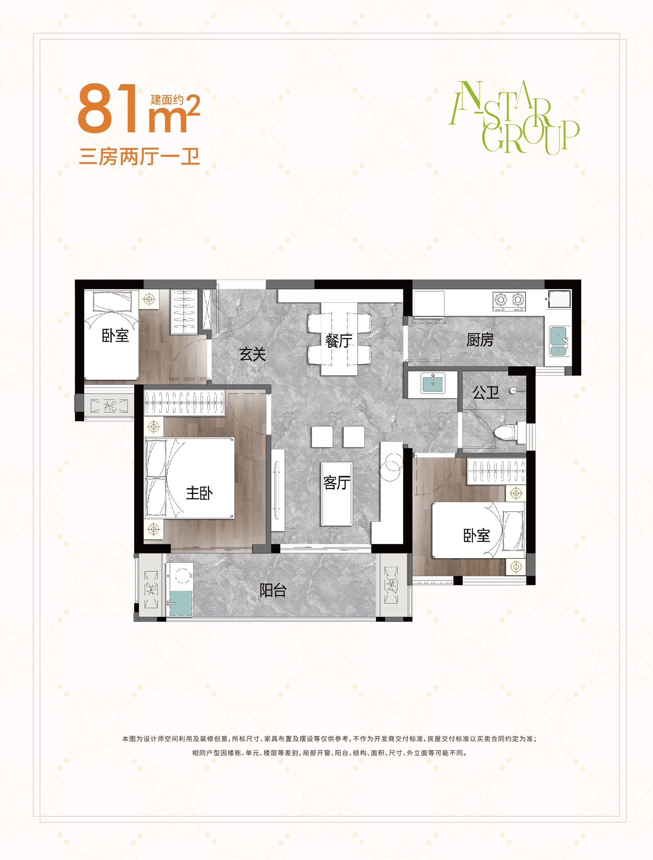 约81㎡三房:主打紧凑三房,满足年轻家庭一步到位的需求,控制总价。