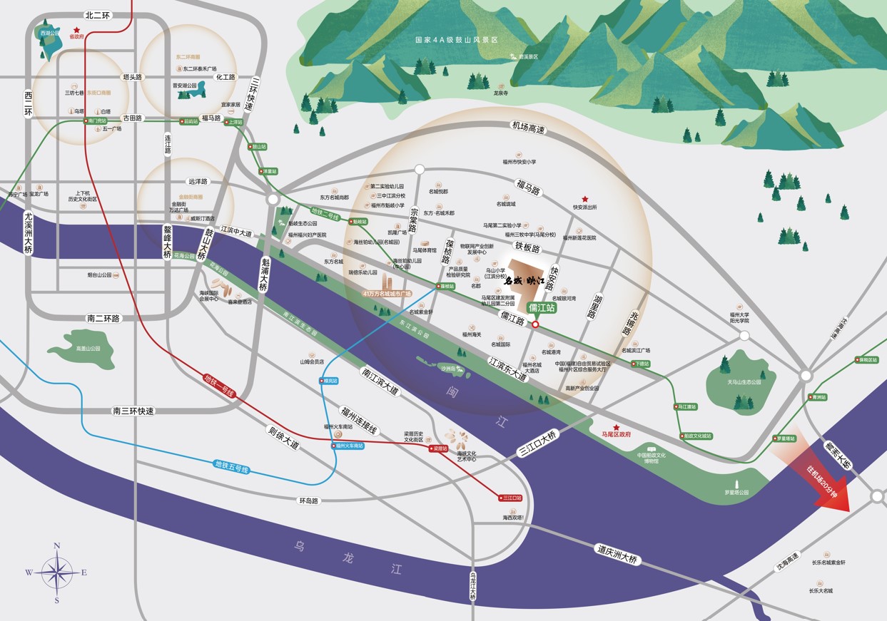 通车后,业主可轻松实现30分钟直达鼓楼核心区,大幅提升通勤效率。此外,项目还享有“三横三纵”主干道与四大过江通道,无论是前往台江万达、东二环泰禾等成熟商圈,还是通往长乐机场,都能快速抵达。