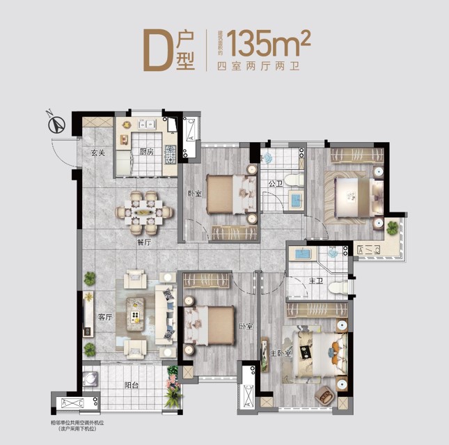 以135㎡四房户型为例,该户型动静分区合理,客厅、餐厅、厨房等动区与卧室、书房等静区互不干扰。项目的得房率高达78%,优于市场平均水平,为业主提供了更多的实际使用空间。