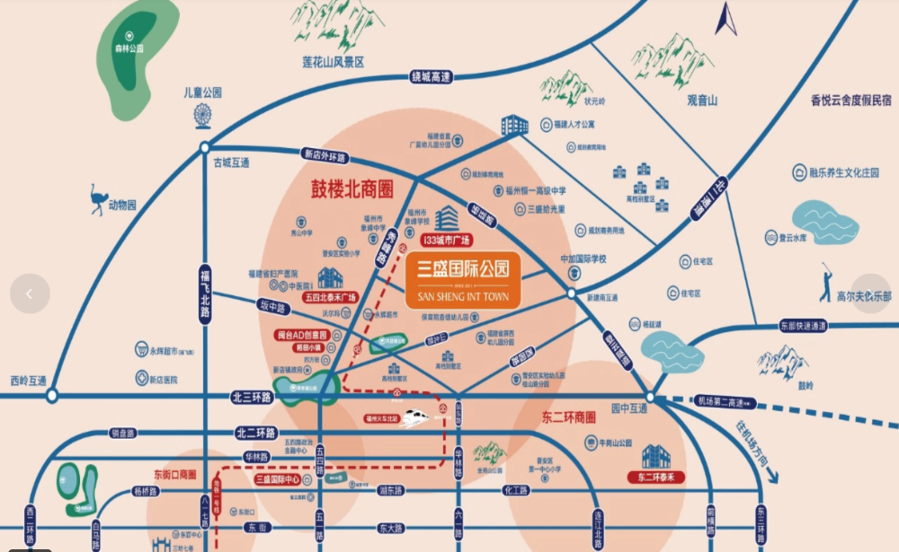 三盛香缇时光坐落于晋安新店镇东园村69号,是三盛国际公园营销中心所在地。项目整体占地约1300亩,是一个集住宅、商业、教育、休闲于一体的大型综合社区。