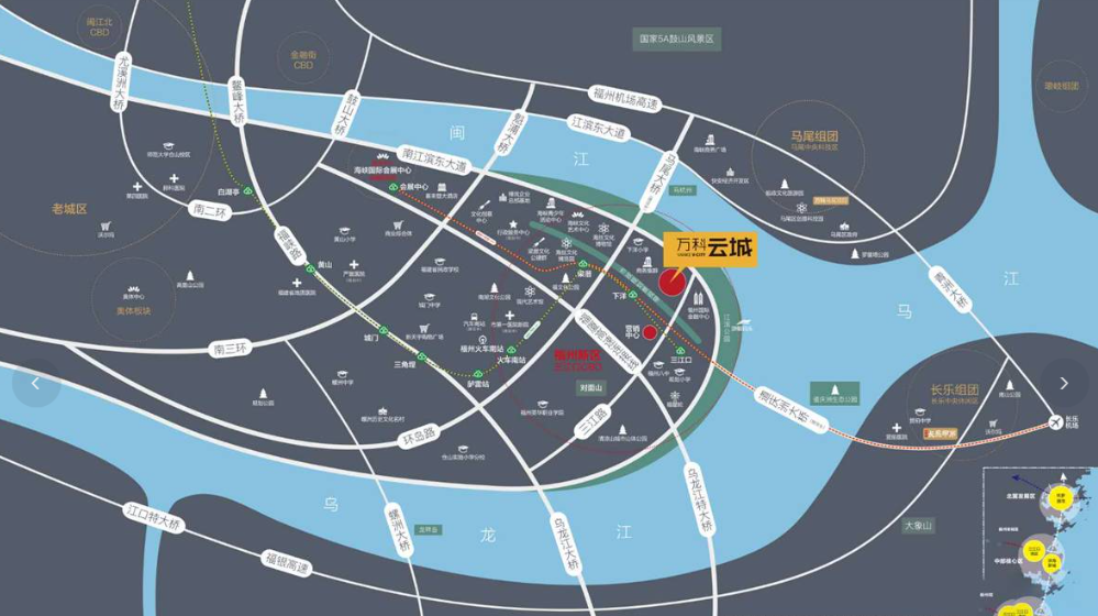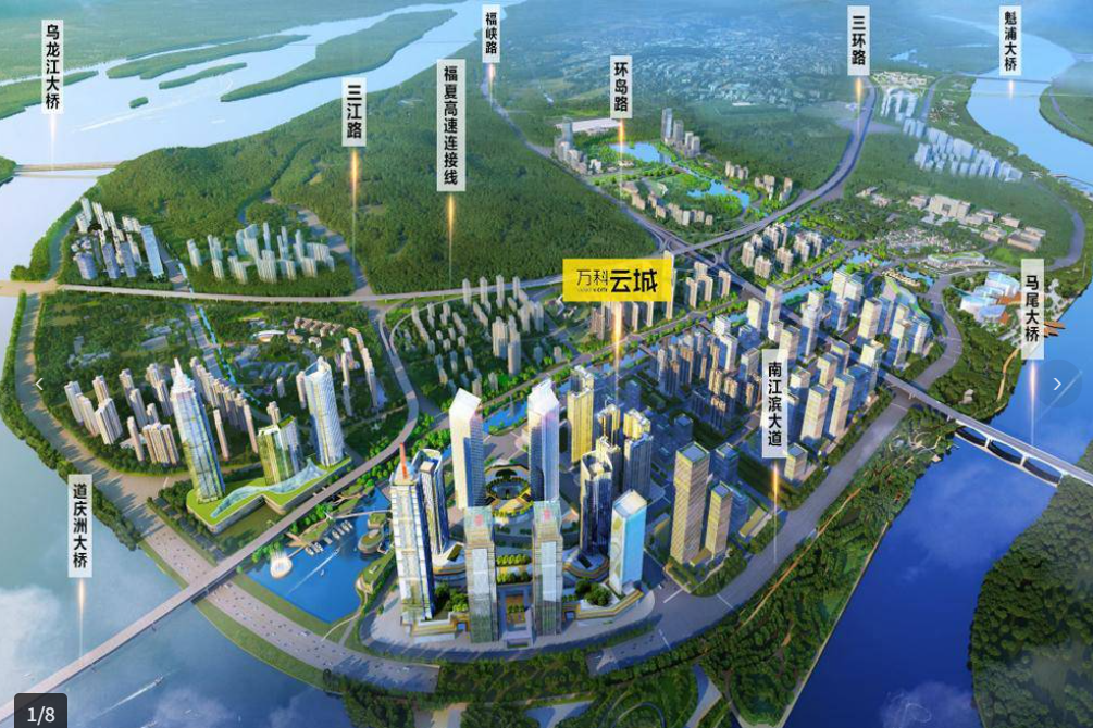 万科云城所处的三江口片区是福州市政府重点打造的新区,目标定位为福州版的“陆家嘴”。项目地处闽江、乌龙江、马江三江交汇处,享有 “五区叠加”政策红利,包括国家级新区和自贸区等政策优势。