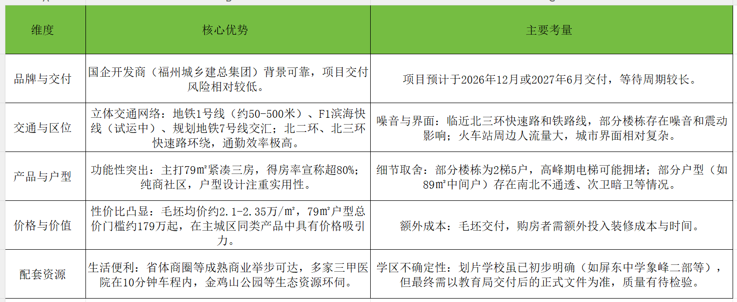 建总云璟未来作为福州晋安区火车站板块的热点楼盘,其核心价值在于用相对亲民的价格,提供了主城区稀缺的“上车”机会。下面通过表格对其核心优缺点进行梳理,帮助您快速建立整体认知。