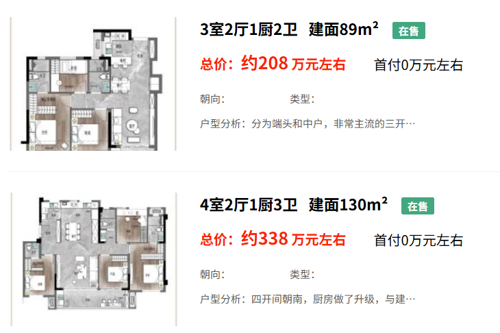 以最小面积89平方米计算,最低总价约200万元;以最大面积130平方米计算,最高总价可达338万元。