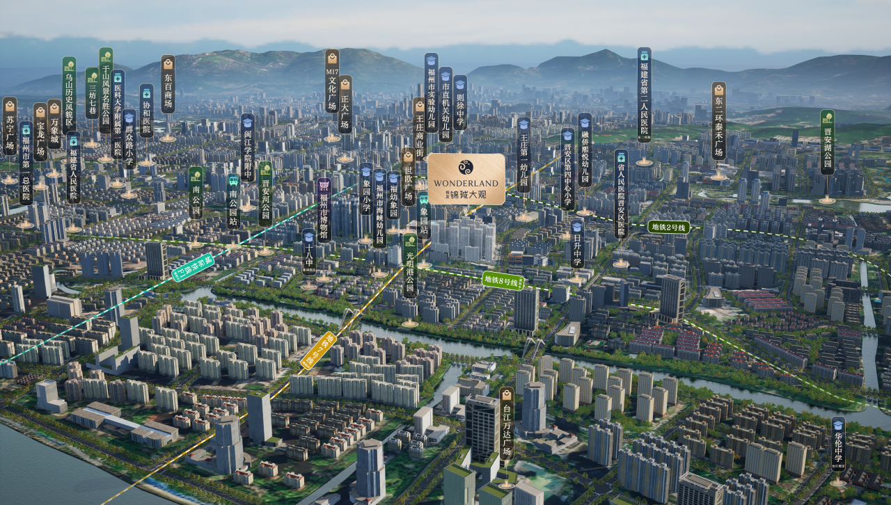 榕发锦珹大观位于晋安、鼓楼、台江三区交汇的王庄核心片区,享受三区资源叠加优势。交通方面,项目坐落于地铁2号线与4号线换乘站前屿站上盖,形成“双地铁+二环”的立体交通网络。