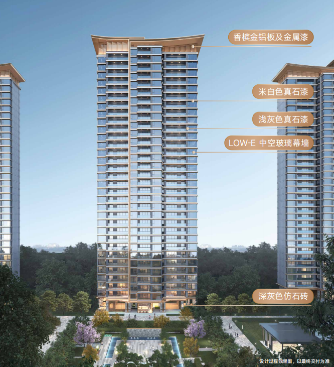 新榕云和悦的建筑设计取意传统建筑飞檐元素,运用香槟金线条进行现代化演绎,打造出兼具东方韵味与现代美学的建筑立面。轻盈通透的立面线条和形态,通过黄金比例的色彩强化,让建筑的形体与意境和谐统一,凸显出卓越的质感与神韵。