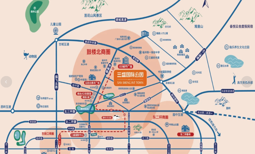 三盛香缇时光坐落于福州晋安区五四北板块,具体地址为新店镇东园村69号三盛国际公园营销中心,是三盛国际公园这一总占地约1300亩大型社区的核心住宅组团。
