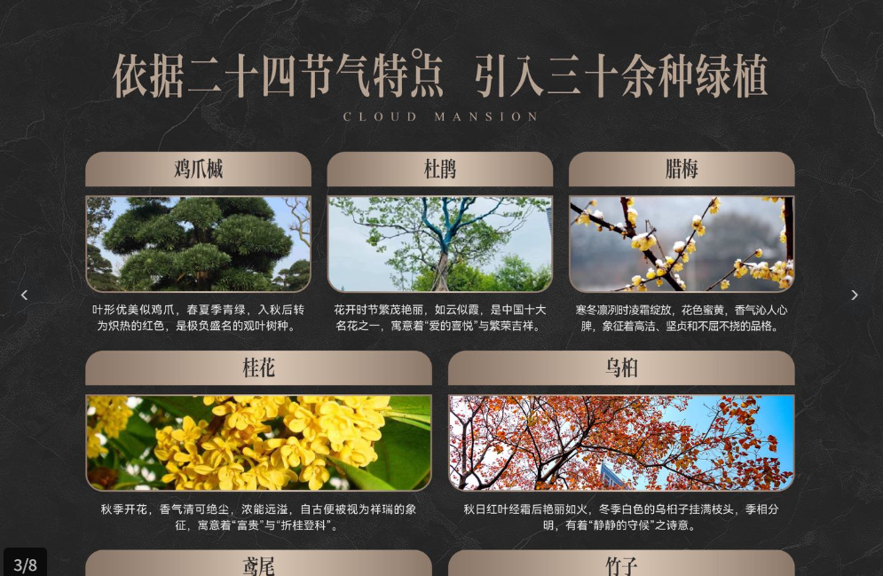 依据二十四节气不同特点,项目重金引入了三十余种花木绿植,营造出富有层次感的景观序列。
