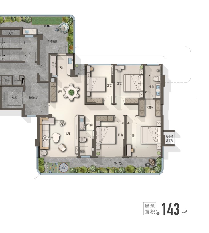 智慧化生活体验:项目采用一梯一户设计,独立电梯前厅与空中花园直接连接,形成双动线入户格局。2025年建筑新规允许更大进深的空中花园,使室内采光和使用效率得到显著提升。设备平台的优化设计也让线路布局更加从容,提升居住舒适度。
