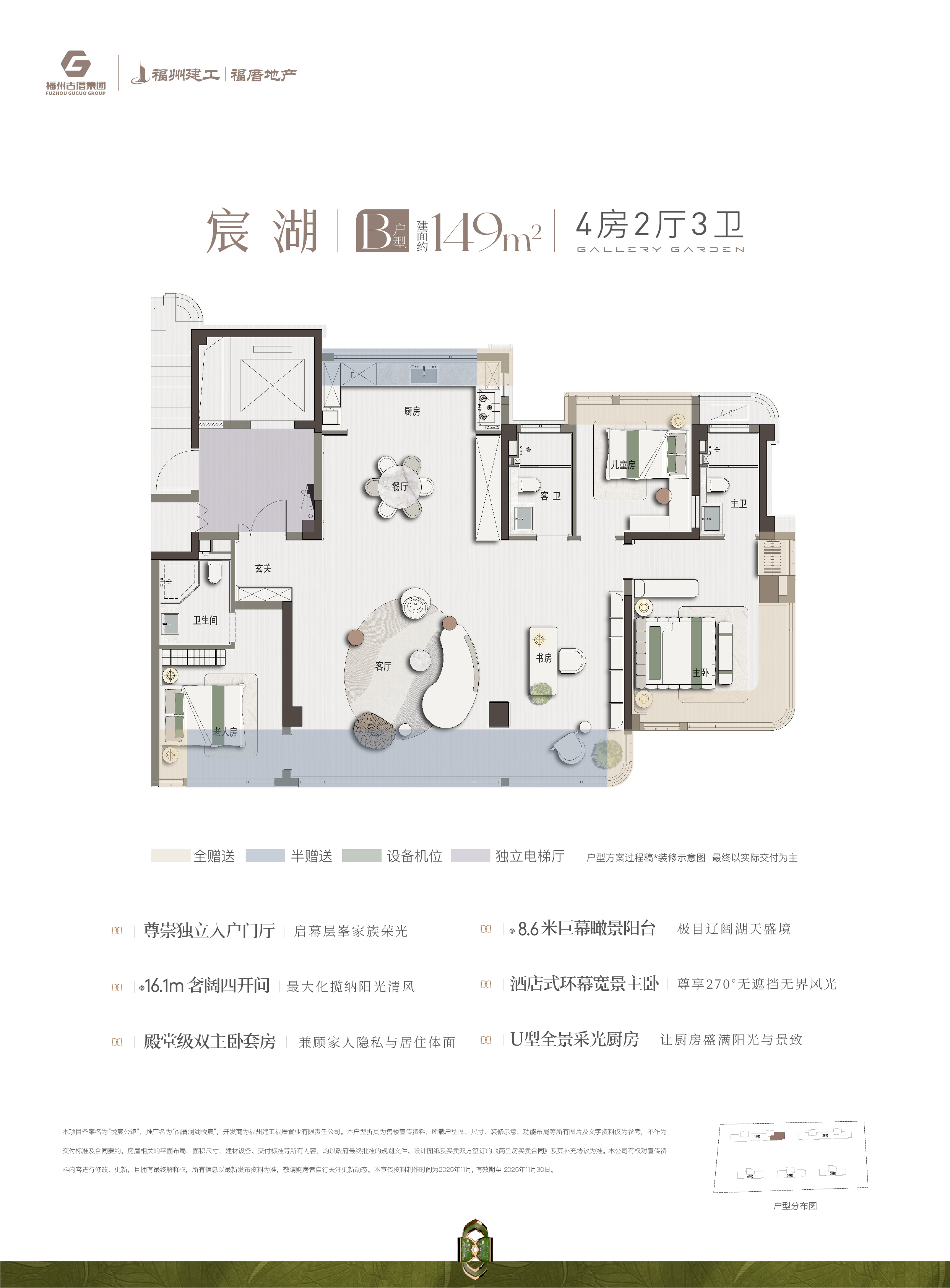 福厝·澜湖悦宸明确面向改善型住房需求群体,户型起步面积约为119平方米,主力户型包括132平方米和149平方米的四房设计,全部为一梯一户布局,层高3.05米,得房率超过95%。