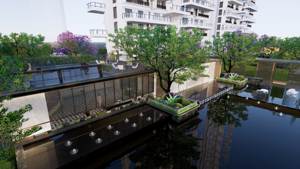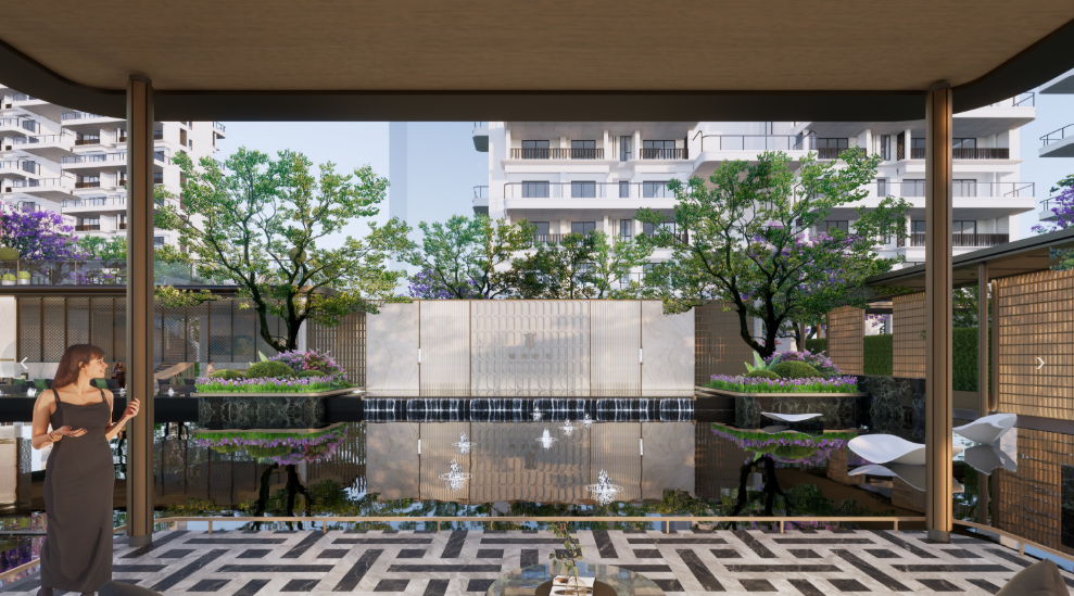 走进锦绣时代约10米高的气派门庭,“一环·二轴·六景”的立体垂直景观体系映入眼帘。从星空水苑到观景平台,水陆空三层次园林体验构筑了一个城市中的生态家园。