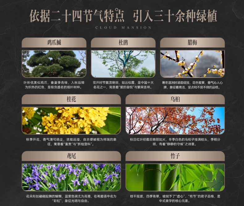 依据二十四节气不同特点,项目重金引入了三十余种花木绿植,营造出富有层次感的景观序列。