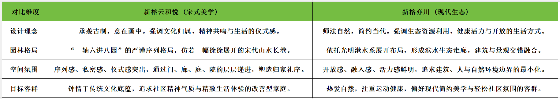 福州新榕云和悦以“宋式美学”为核心的园林设计,与其同系的新榕亦川所主打的现代生态风格,形成了鲜明对比。这两者并非简单的高低之分,而是代表了两种不同的产品哲学与生活方式取向。云和悦的核心优势,在于它成功构建了一个兼具深厚文化仪式感、如诗画般意境,并能深度融入日常的沉浸式生活场景