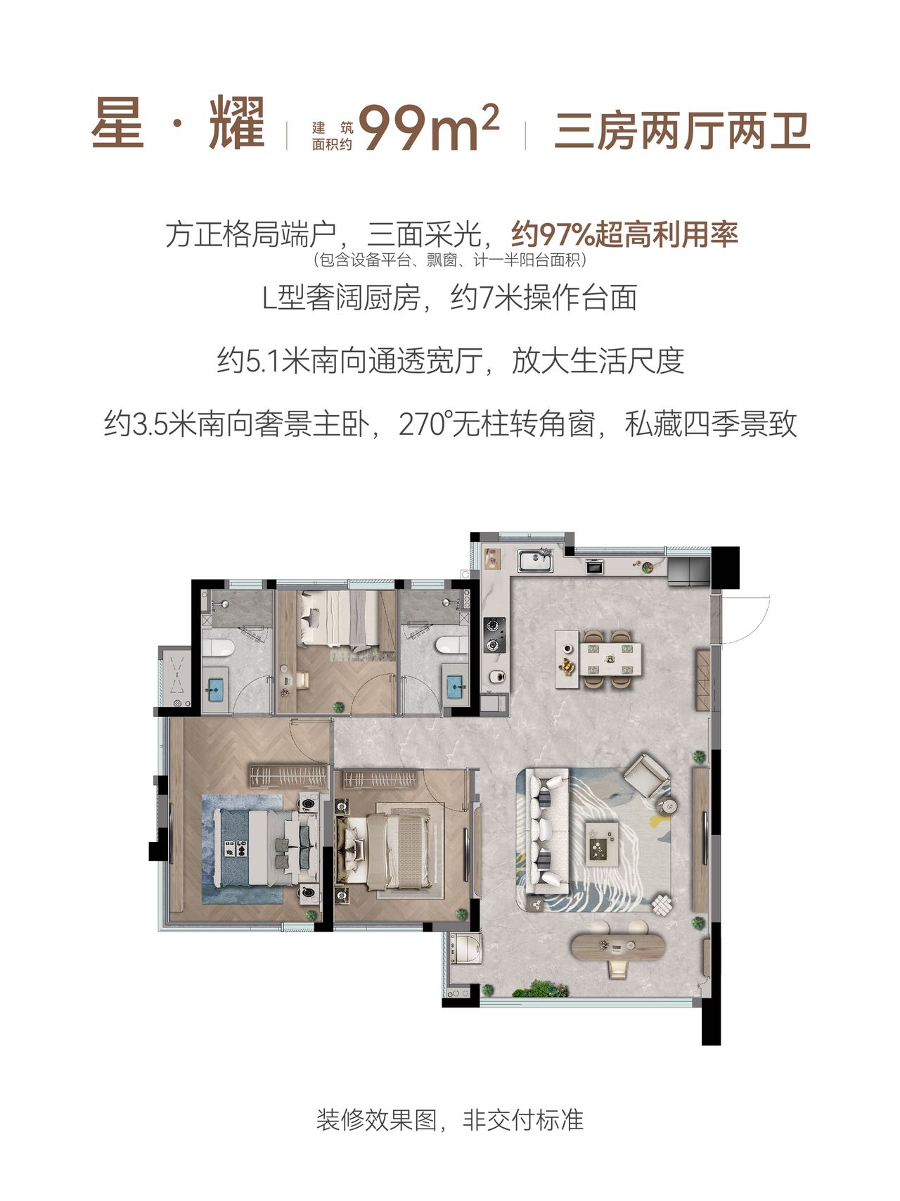 而约99㎡的改善户型则定位为舒适端户,拥有更优的采光面和通风效果,三房空间布局更为阔绰,能满足对居住品质有更高要求的家庭。