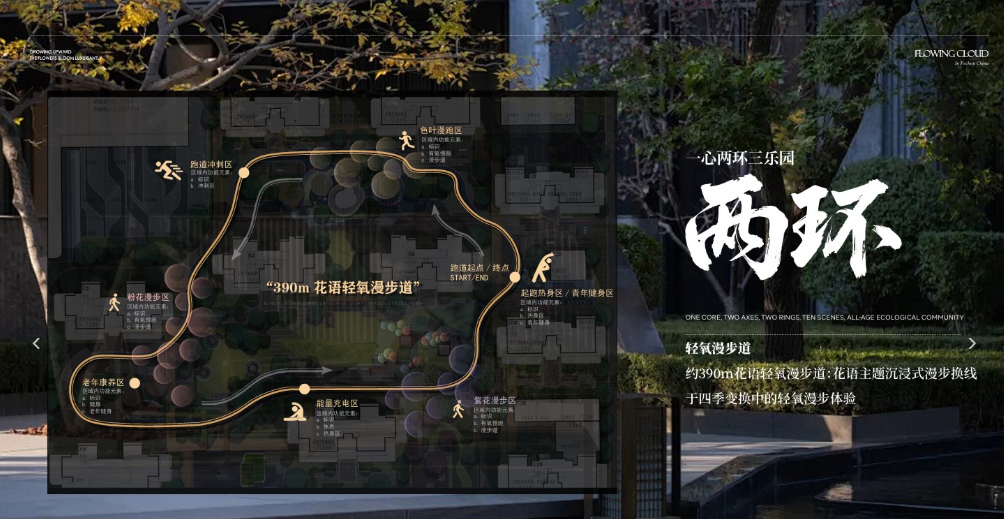 社区内部提出了 “一心两轴双环十境” 的聚气格局,通过约390米双环漫游系统串联起整个社区的功能空间。