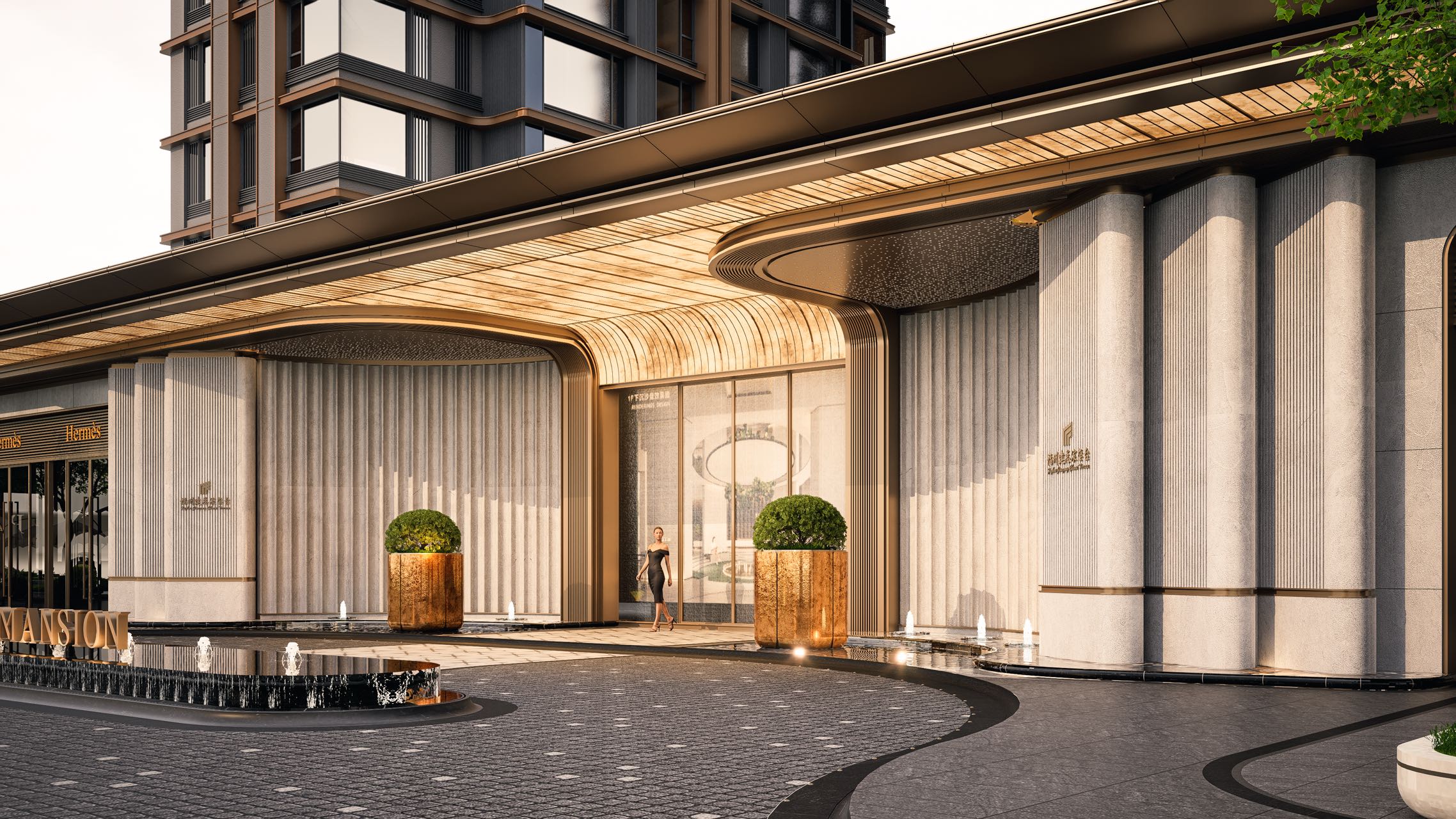 项目采用公建化玻璃幕墙外立面,搭配5.1米高架空层与酒店式落客区,社区入口设5.1米架空层,提供酒店式落客区及归家度假体验,增强了归家的仪式感。