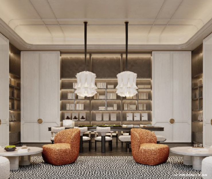 建筑采用干挂石材外立面,这种工艺造价远高于常见材料,体现了“Old Money”式的质朴与温润,是现代铝板玻璃幕墙无法替代的经典质感。