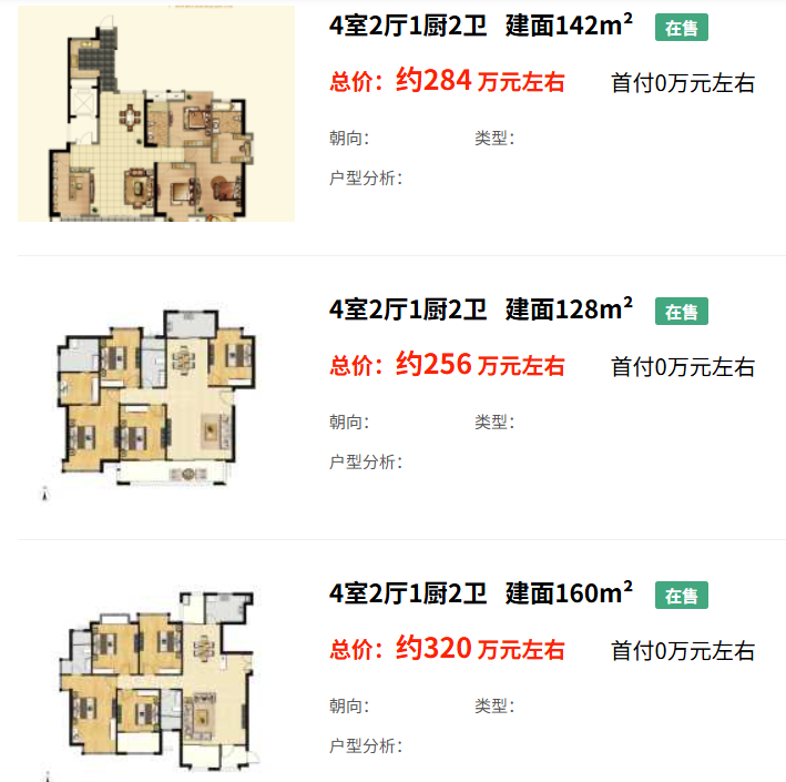 具体在售户型包括三房两厅两卫(90-109㎡)、四房两厅两卫(118-164㎡)以及四房两厅三卫(199-220㎡)。