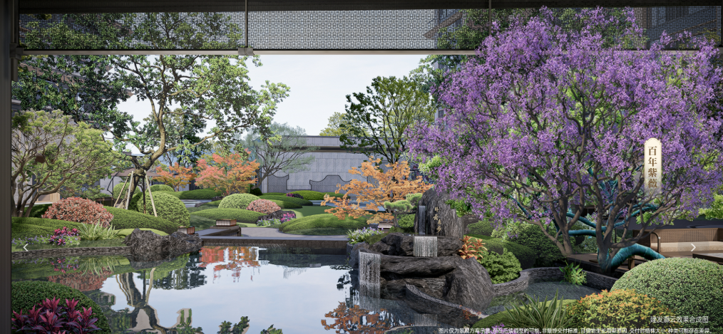 社区内部采用“二轴六园八景双中庭”的禅境中式园林设计,营造出移步换景的东方美学空间。