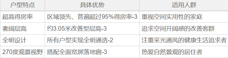 所有户型均采用南北朝向设计,充分考虑了采光、通风与居住动线的合理性。项目户型具有以下显著特点: