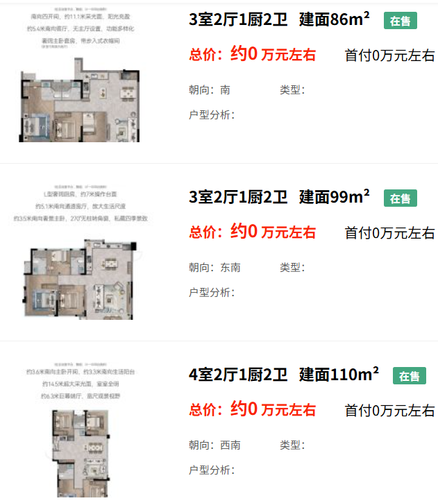具体来看,86平方米户型均价约29406元/平方米,99平方米户型均价约29956元/平方米,110平方米户型均价约30956元/平方米。