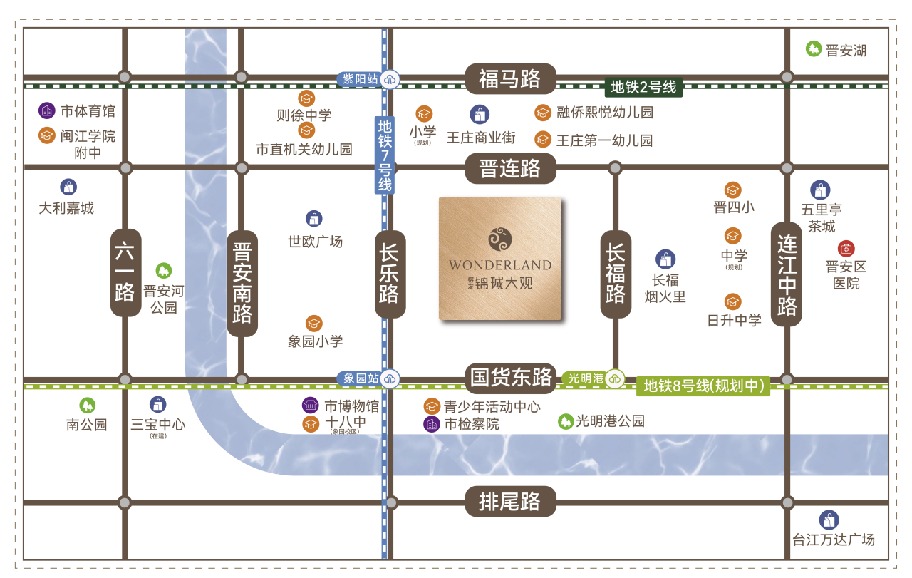 交通:已运营的地铁2号线紫阳站与规划中的地铁7号线(以官方最终批复为准)将实现“双地铁”覆盖,是主城罕见的轨交配置。同时,项目被连江路、国货路、长乐路等城市主干道环绕,无论驾车或公交出行,通达性极强。