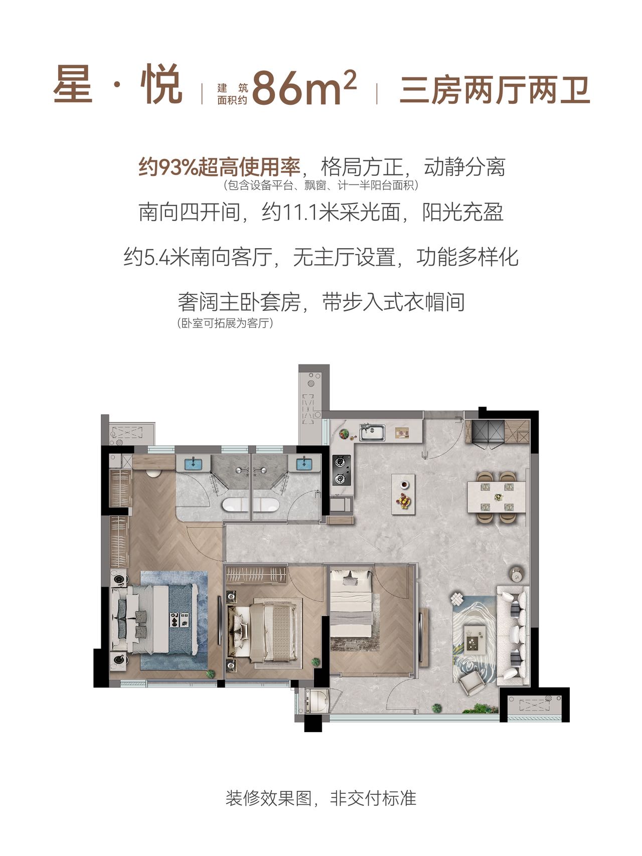 极致得房率:得益于新规,项目得房率高达约92%-97%,这意味着购买建筑面积约85㎡的户型,实际可得使用面积与许多旧规95㎡的户型相当,性价比凸显。