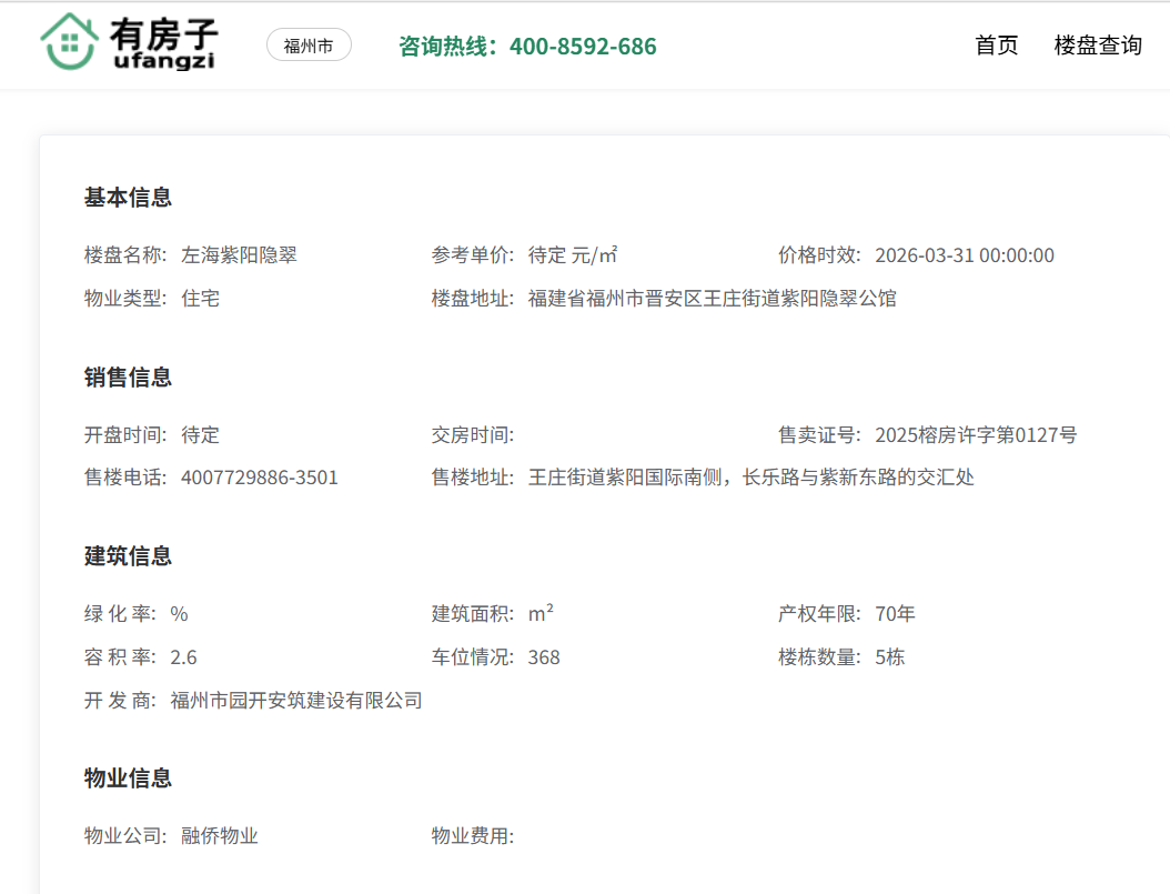 在福州楼市中,左海紫阳隐翠无疑是一个极具话题性的项目。顶着“福建省首个宁静住宅铂金级认证”的光环,凭借约5.2万/㎡的精装备案均价和800万起步的总价,它试图在晋安王庄这片老城区树立一座“灯塔” 。然而,当我们将滤镜摘下,从自住舒适度与资产流通性的角度重新审视,这个由国企左海控股(福州市园开安筑建设有限公司)开发的楼盘,实则面临着诸多难以回避的尴尬与挑战 。