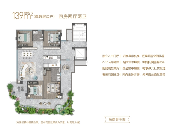 明星户型108平米:虽为入门级,却做到了四室两厅两卫,且采用横厅设计,得房率可观。更重要的是,作为第四代住宅,即便是108平米户型,也能拥有约12平米的空中花园,实现了“家家有庭院”的梦想 。