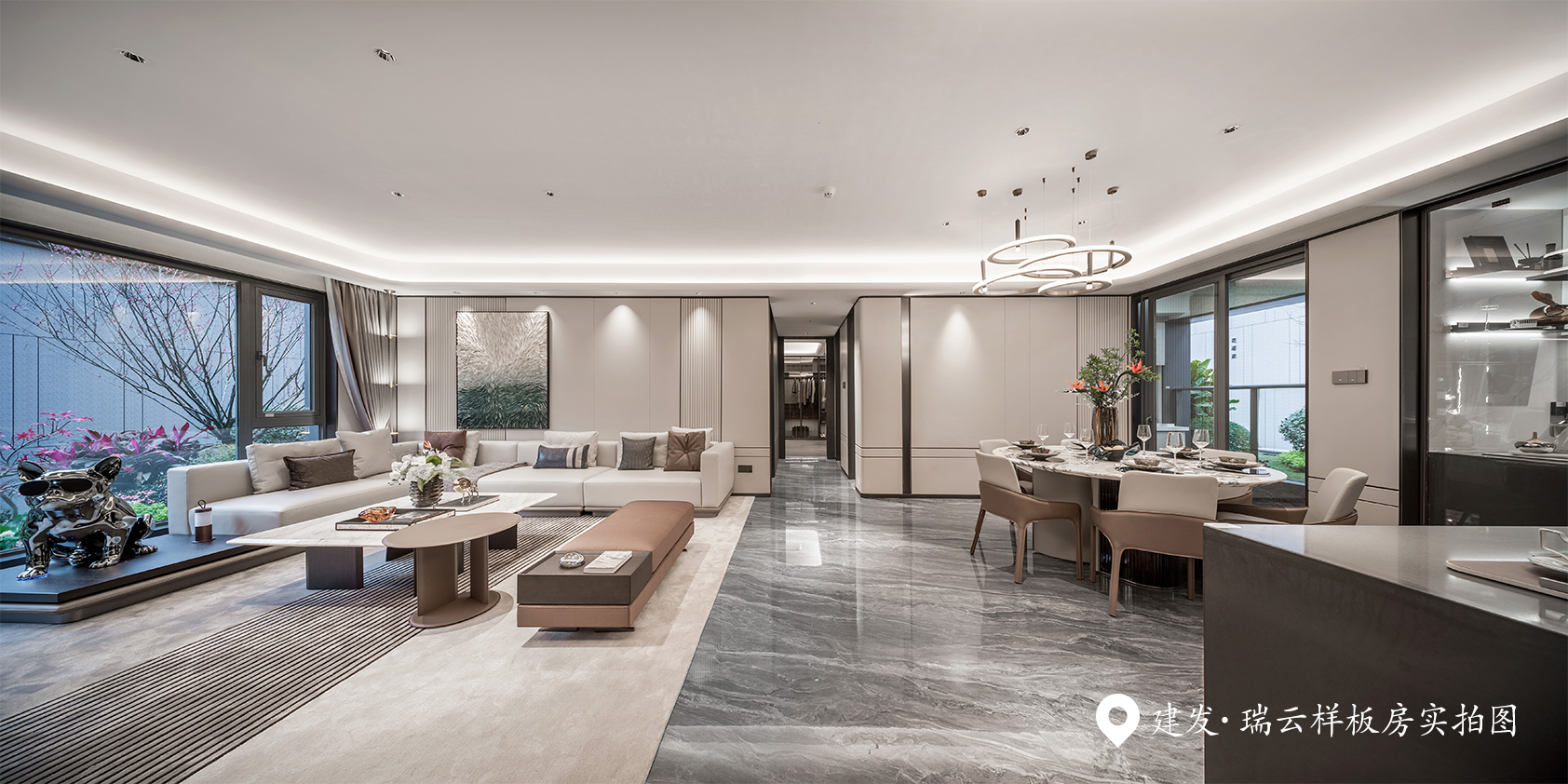 建发瑞云则极致展现了建发标志性的“新中式王府风”。高约8米的王府大门、采用伊朗“蓝眼睛”石材的立面,尽显归家礼序与厚重感。园林是经典的禅境中式园林,构造亭台水榭、月洞门等景观。户内配备了15.6寸智慧中控屏,集成全屋智能与社区服务。户型设计强调“小家化”主卧套房和独立门厅,部分户型拥有270°转角视野。