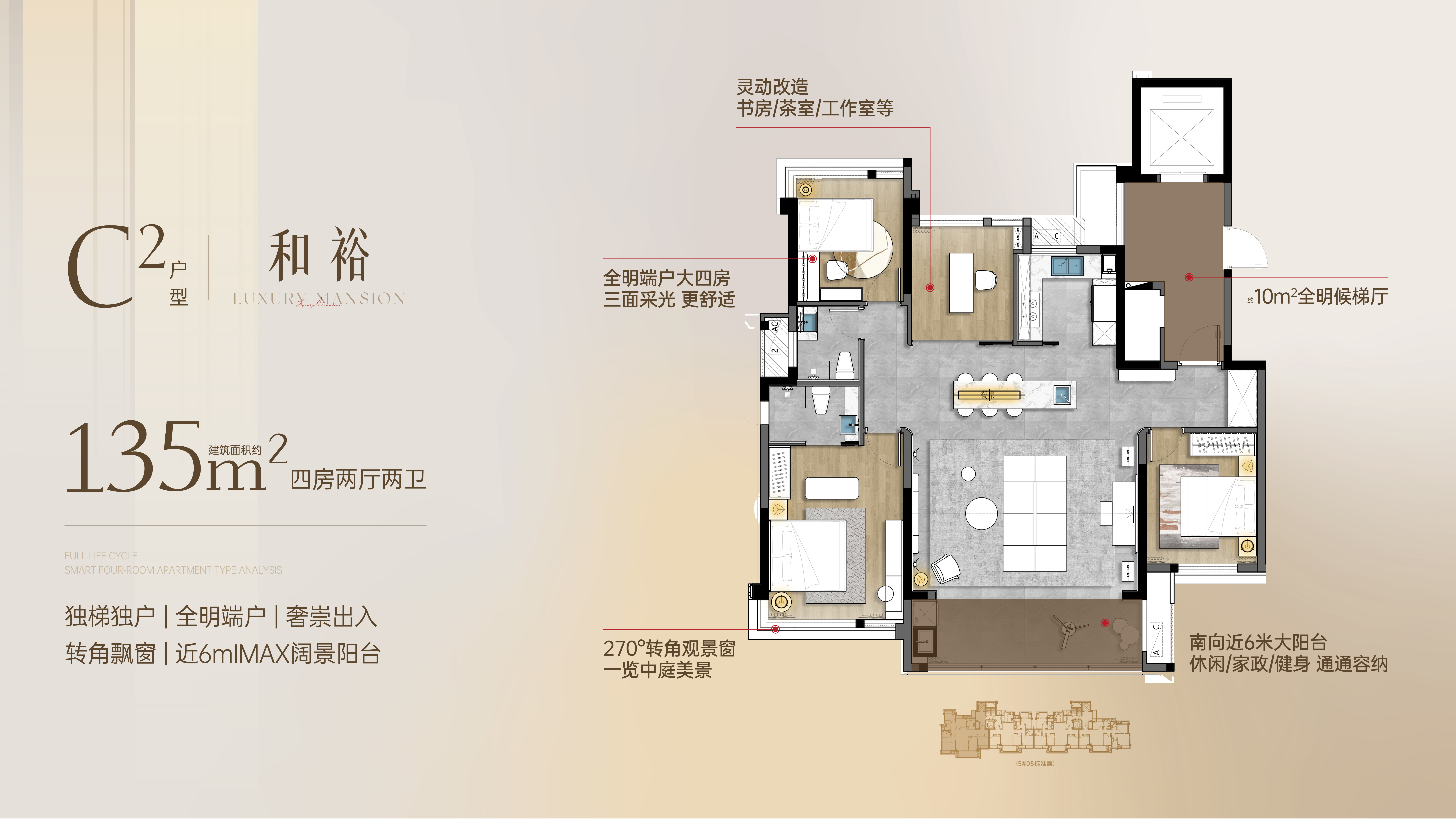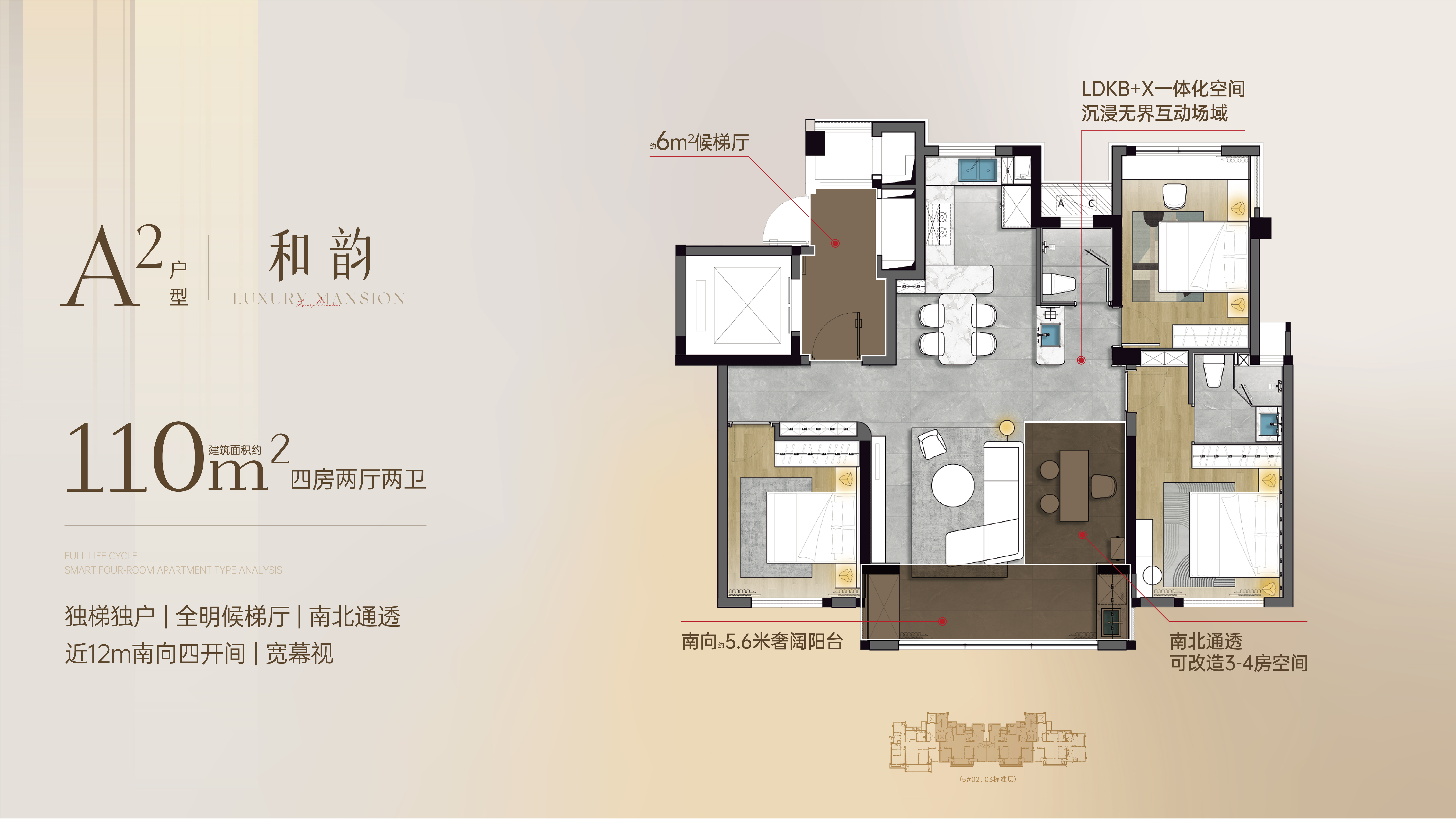 在户型设计上,项目主打建面约108-138㎡的纯板式结构,确保了每一户的南北通透。例如建面约110㎡的户型,通过LDKB(客餐厨阳)一体化设计,配合“X”灵动空间,可以根据家庭生命周期改造成四房,无论是二胎家庭还是三代同堂都能轻松应对 。而约135㎡的端户,更是做到了四开间朝南,拥有极佳的采光面 。
