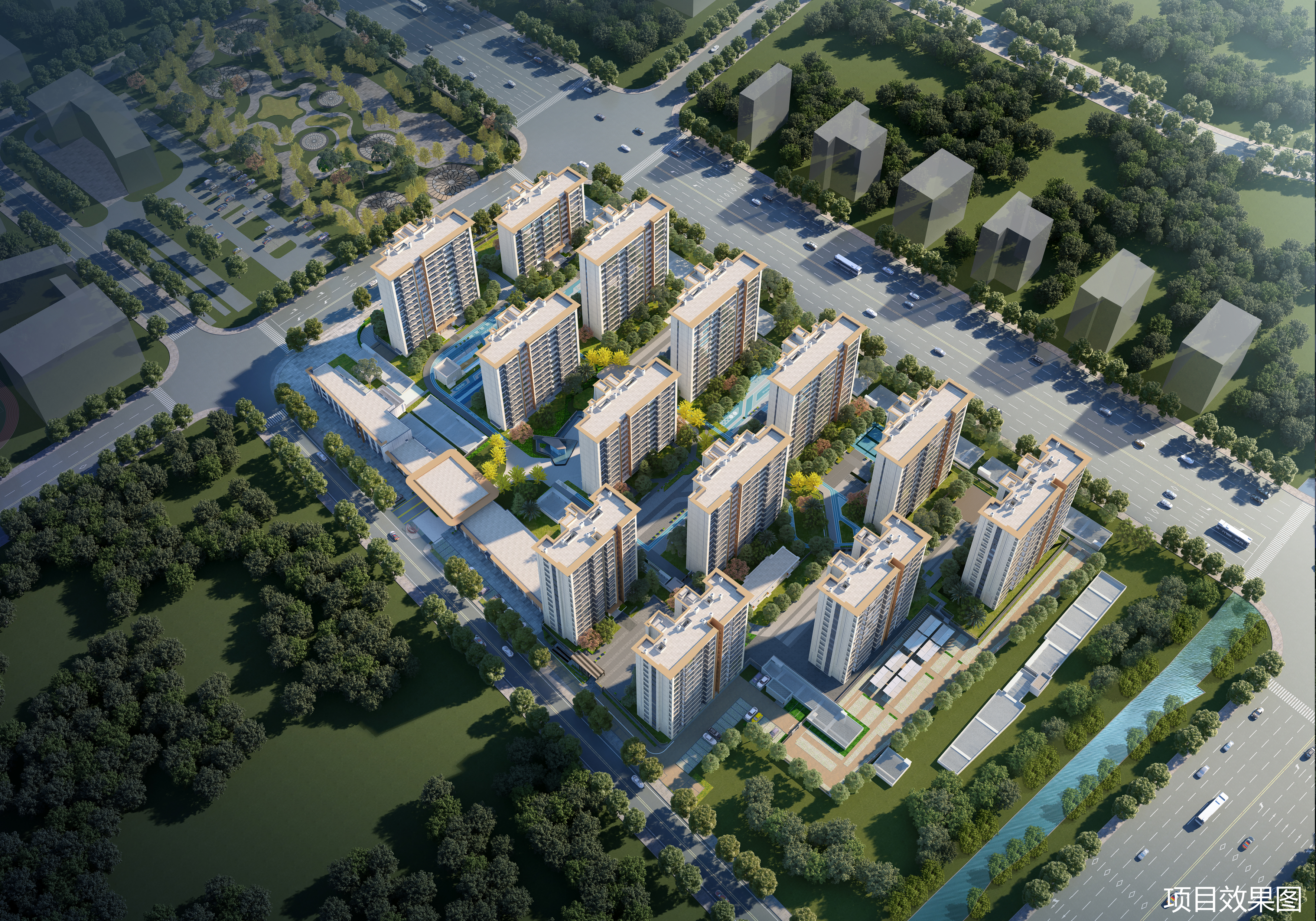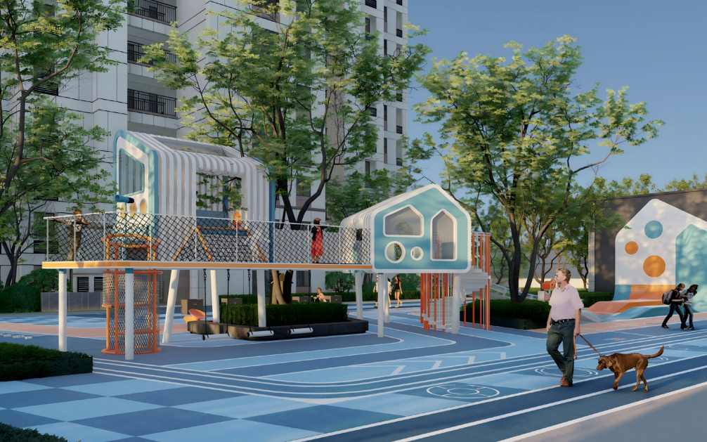 项目规划为9-14层的小高层社区,相比动辄30多层的超高层的社区,居住密度更低,得房率也相对更高 。配合社区内部规划的“一轴一环六园”景观及近300㎡的架空层泛会所(书吧、健身房等),它试图在拥挤的老城区中开辟出一片低密度的生活绿洲。
