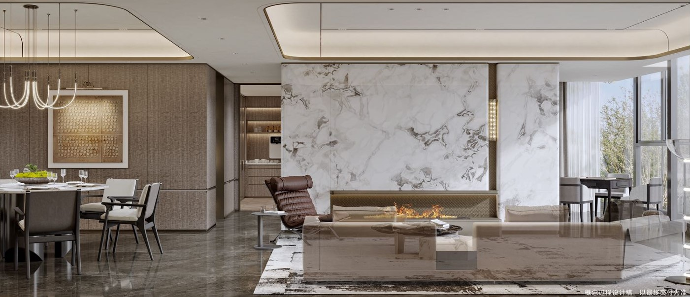 以建面约165㎡的逸境样板房为例,通过大面积的阳台及露台赠送,其实际使用空间远超建筑面积。近61.5㎡的餐客横厅、近30㎡的主卧套间,确实做出了大平层该有的奢阔感。