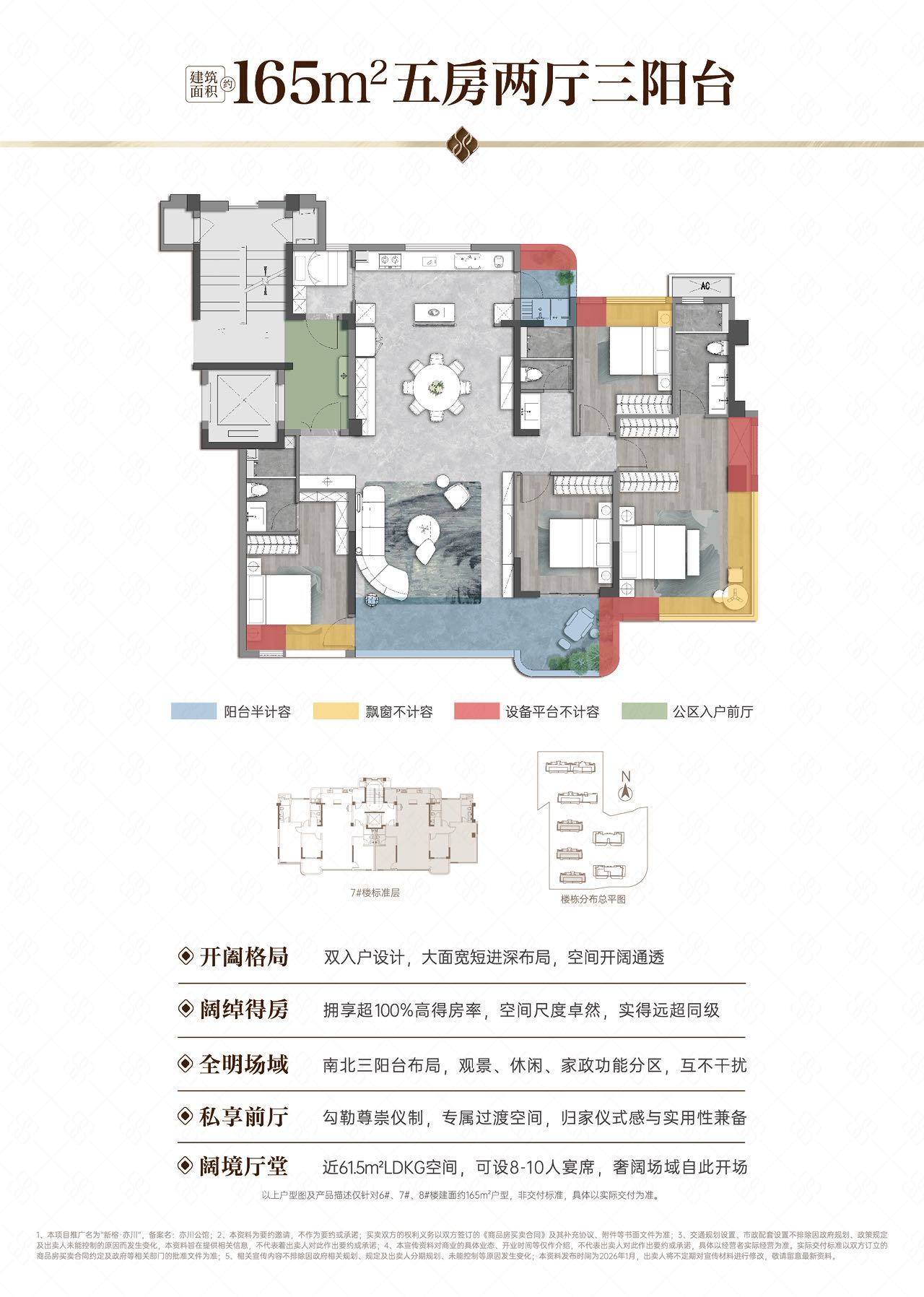 以主力建面约165㎡的户型为例,得益于创新的设计和大面积的阳台、飘窗赠送,实际使用面积远超建筑面积,得房率高达约101%。这意味着,同样是市场上的550万总价预算,你买到的不再是普通高层的“紧凑感”,而是实实在在的“大宅体验”: