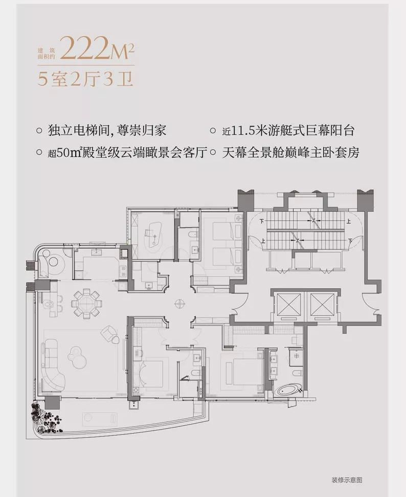 222㎡大平层:项目的标杆之作。拥有270°转角阳台,部分高楼层房源可将流花溪与乌龙江双重水景尽收眼底。层高提升至3.3米,阳台进深扩展至2.4米,带来IMAX级的视觉享受和豪宅居住体验 。