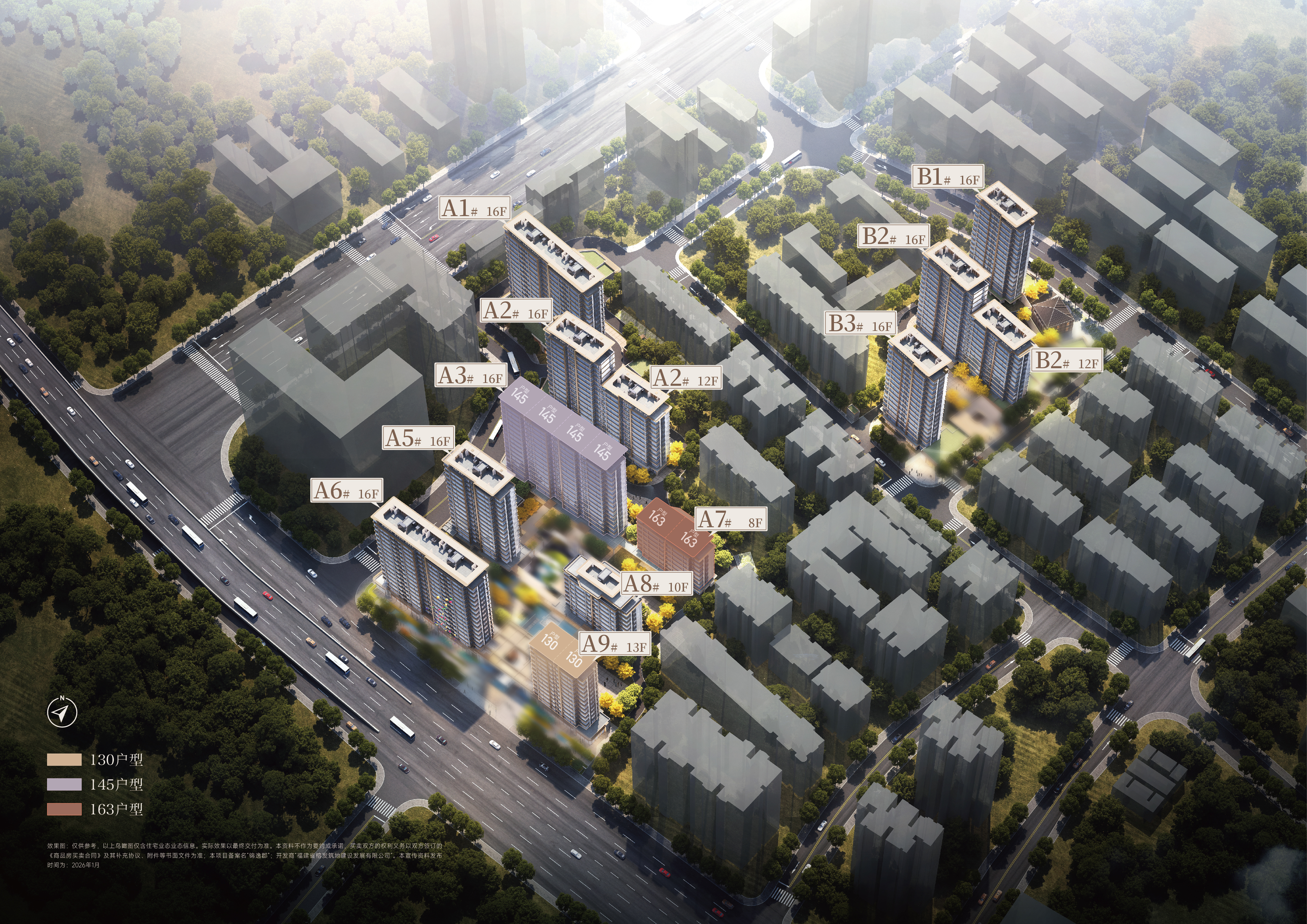 规划层面,榕发锦樾占地约 46.44 亩,总建筑面积约 8.9 万㎡,容积率仅 2.18,是主城核心极为少见的低密住区。项目规划 11 栋 8—16 层洋房及小高层产品,总户数仅 428 户,无安商房、无小户型,定位纯粹改善。户型起步 130㎡四房,主力 145㎡四房,顶流 163㎡洋房产品,主打一梯一户、私梯入户、大面宽、双主卧套间等改善配置,145㎡户型拥有约 8 米南向大阳台,163㎡洋房搭配 270° 环幕视野,部分房源可瞰南公园景观,居住舒适度突出。社区配建约 2920㎡商业及三大会所,绿地率≥30%,车位比约 1:1.33,硬件指标符合高端改善标准。
