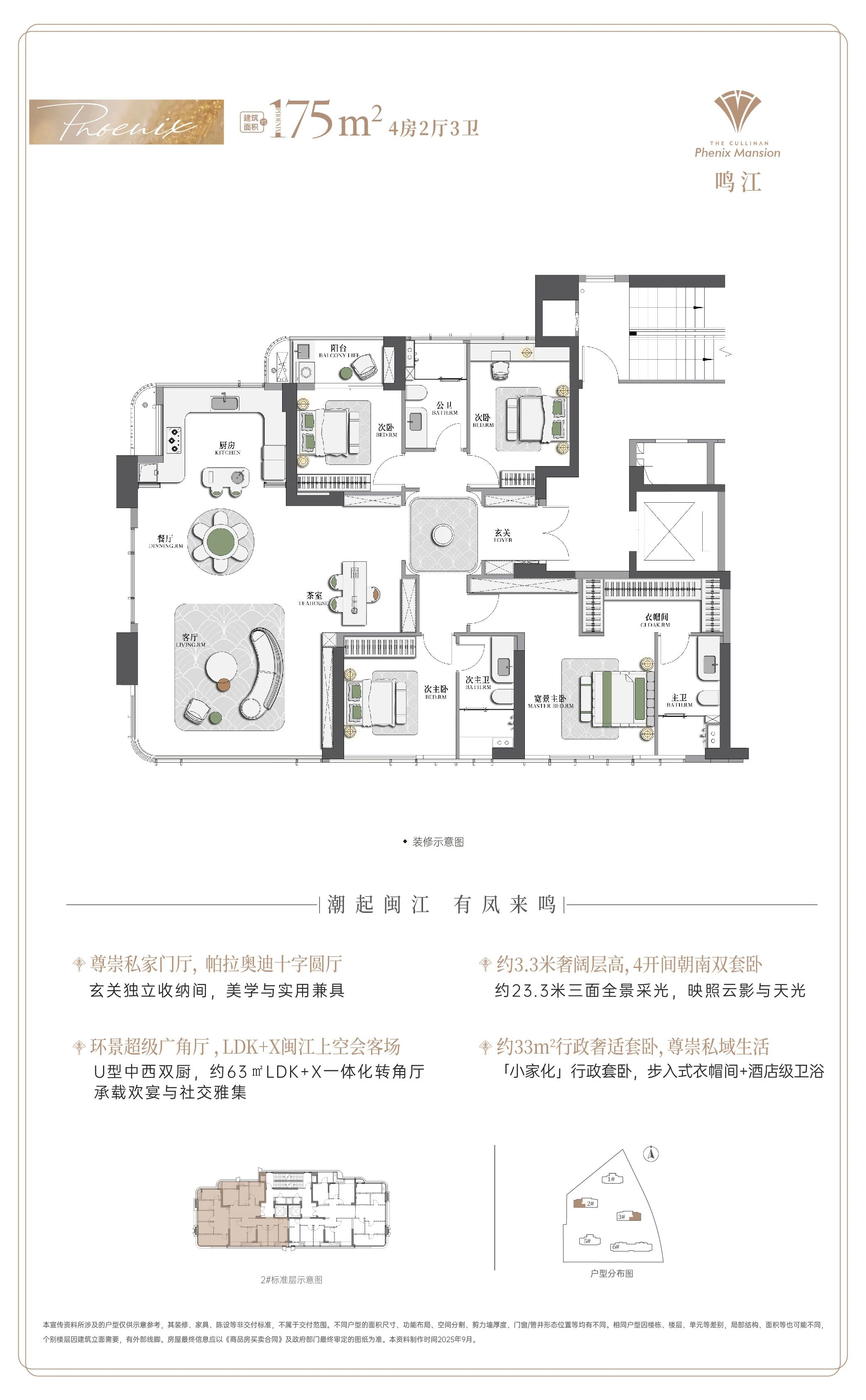 福厝凤鸣天玺在产品定位上走得非常清晰。整个楼盘只有288户,所有户型均为149平方米起步的大平层设计。主打户型面积段包括149平方米、175平方米和205平方米,全部均为四房或四房以上的布局。