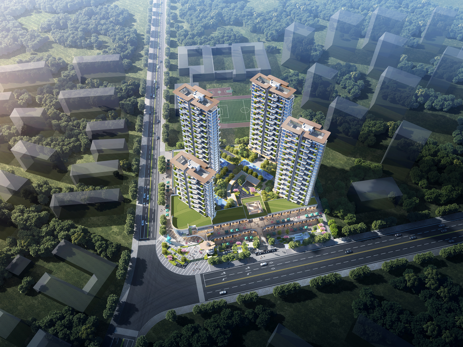 空中庭院系统:户户配备挑高≥6米的超大阳台,打造私属“空中庭院”,并引入垂直绿化概念,有效改善微气候。