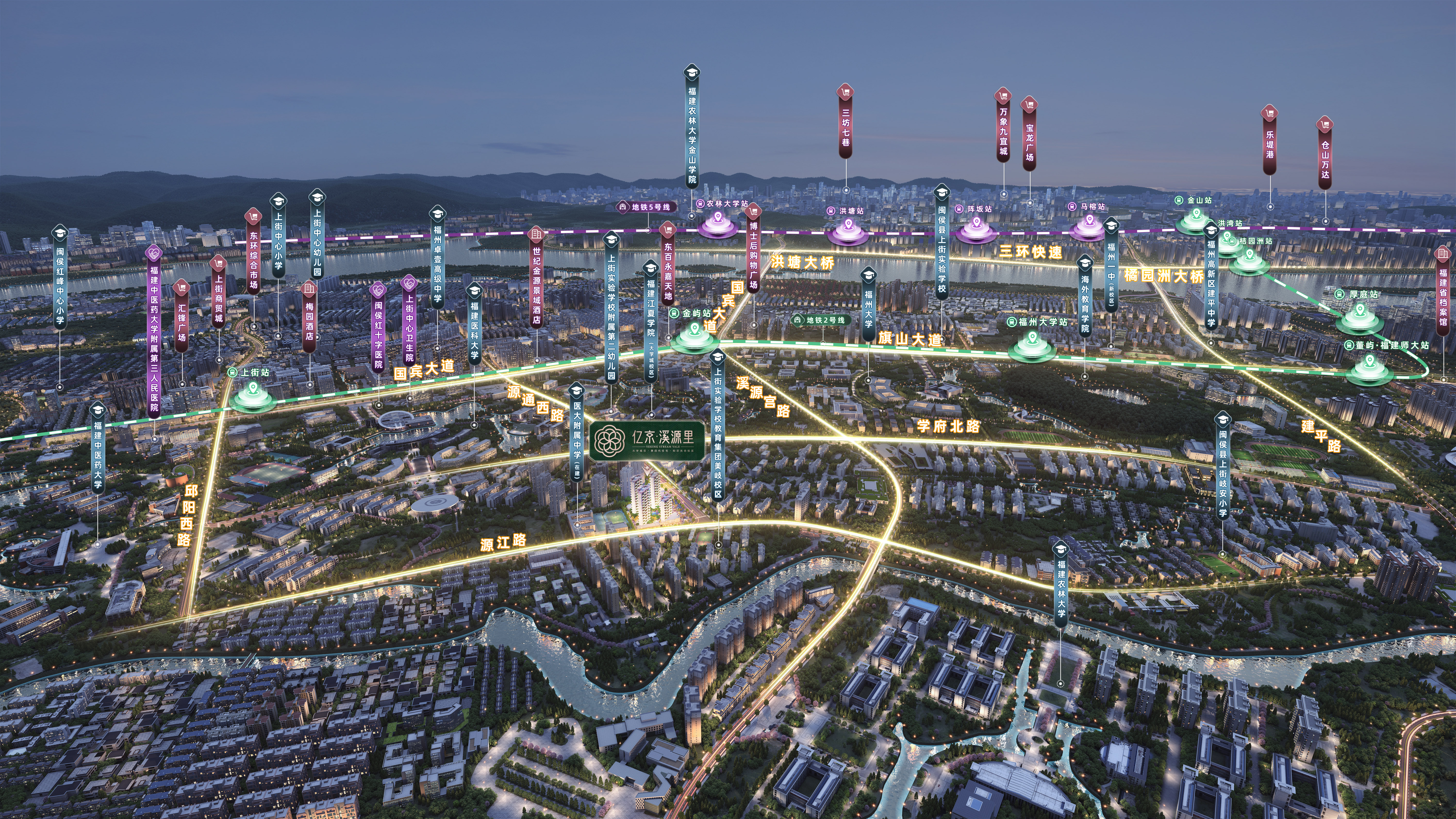 项目最大的优势之一在于其无可复制的地段。它雄踞闽侯上街大学城的绝对核心腹地,具体位于源江路与源通西路交汇处,北侧紧邻福建医科大学,周边被13所高校环伺,形成了独特而浓厚的高知人文圈层。