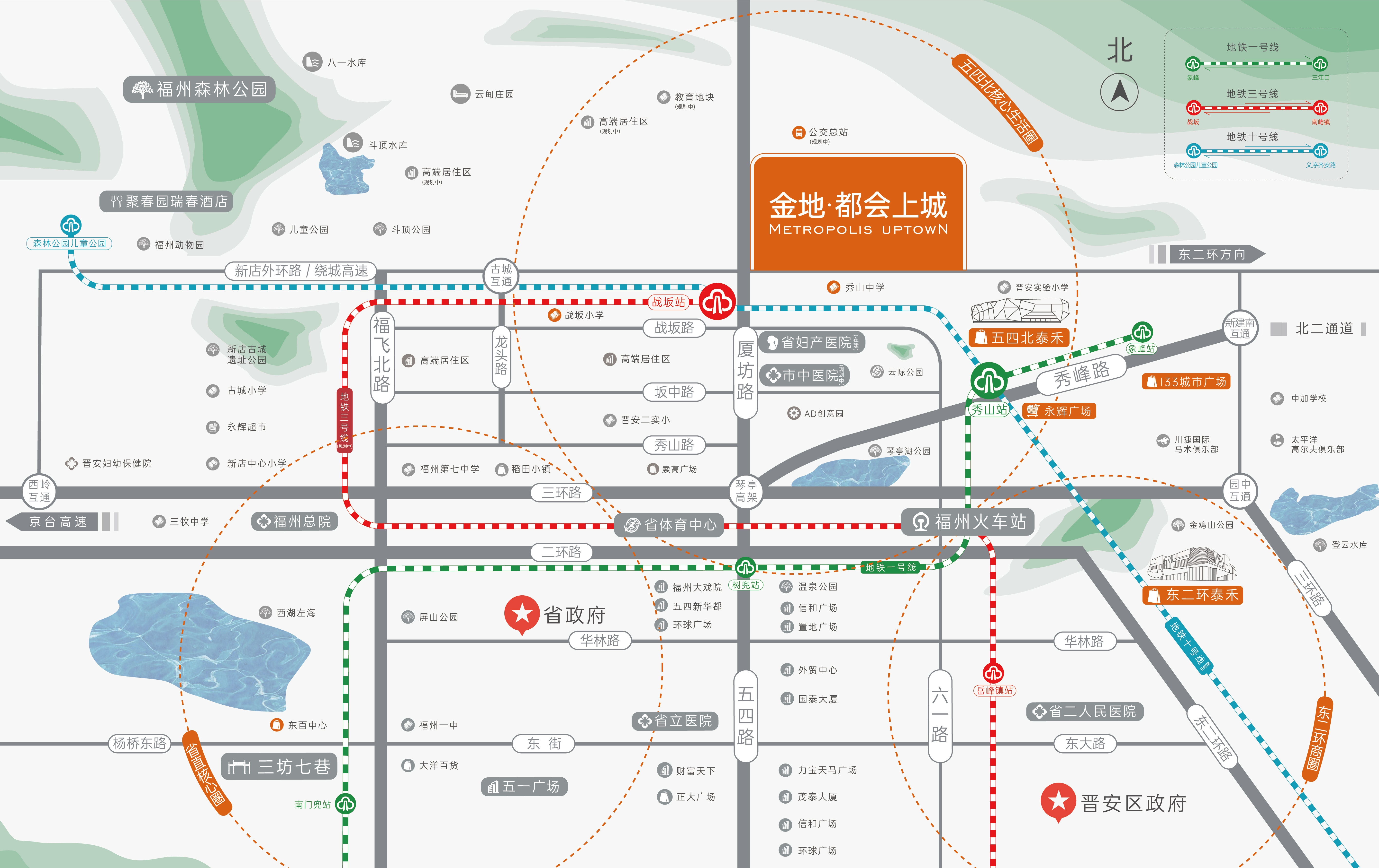 福州省府圈内,五四中轴之上,距五四路核芯区直线距离约4.7公里。交通便利,地铁一号线秀山站(1.3公里),三号线(战坂站300米),福飞路距离项目的直线距离仅1公里,向南可快速到达屏山省政府;厦坊路延伸段可以直达我们项目,并且厦坊路可以直通秀峰路,华林路,到达五四路CBD将更加的便捷;新店外环往北通过在建的北二通道快速到达连江贵安,往南可以到达东二环和南江滨。项目还可连接绕城高速快速通达全城以及通往省内其他地方。